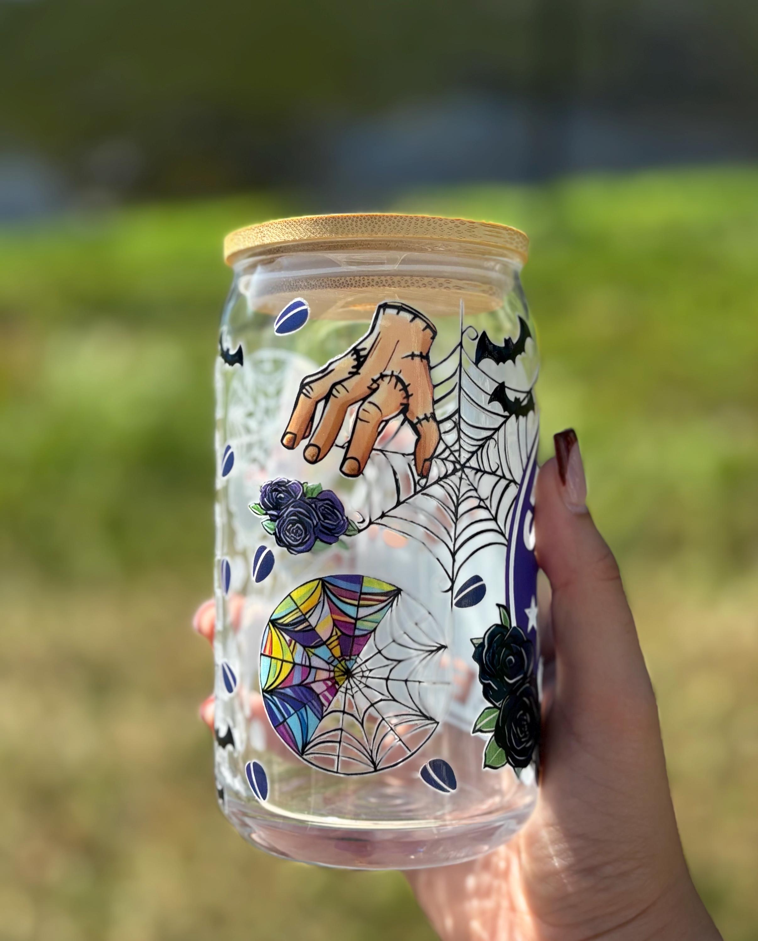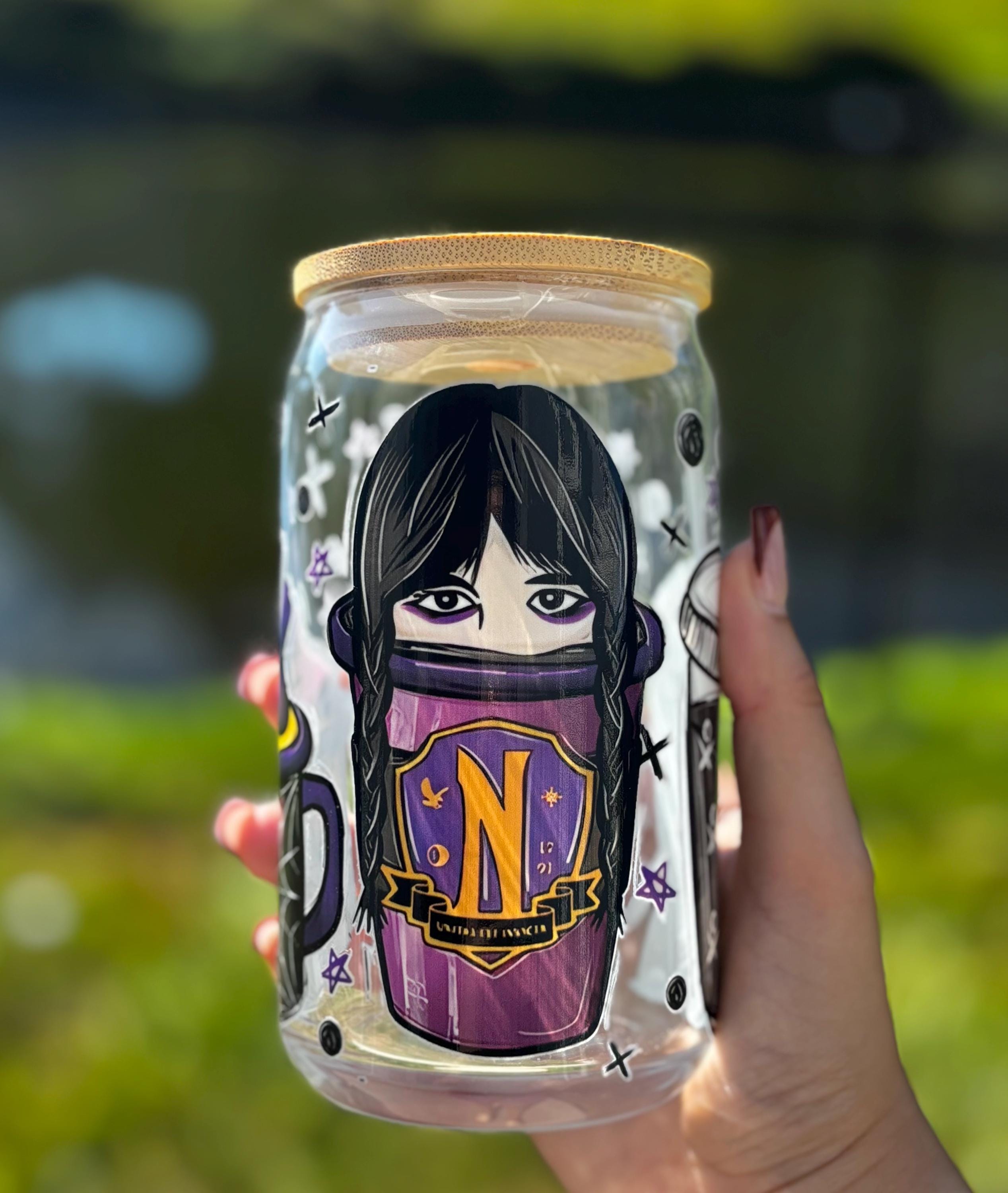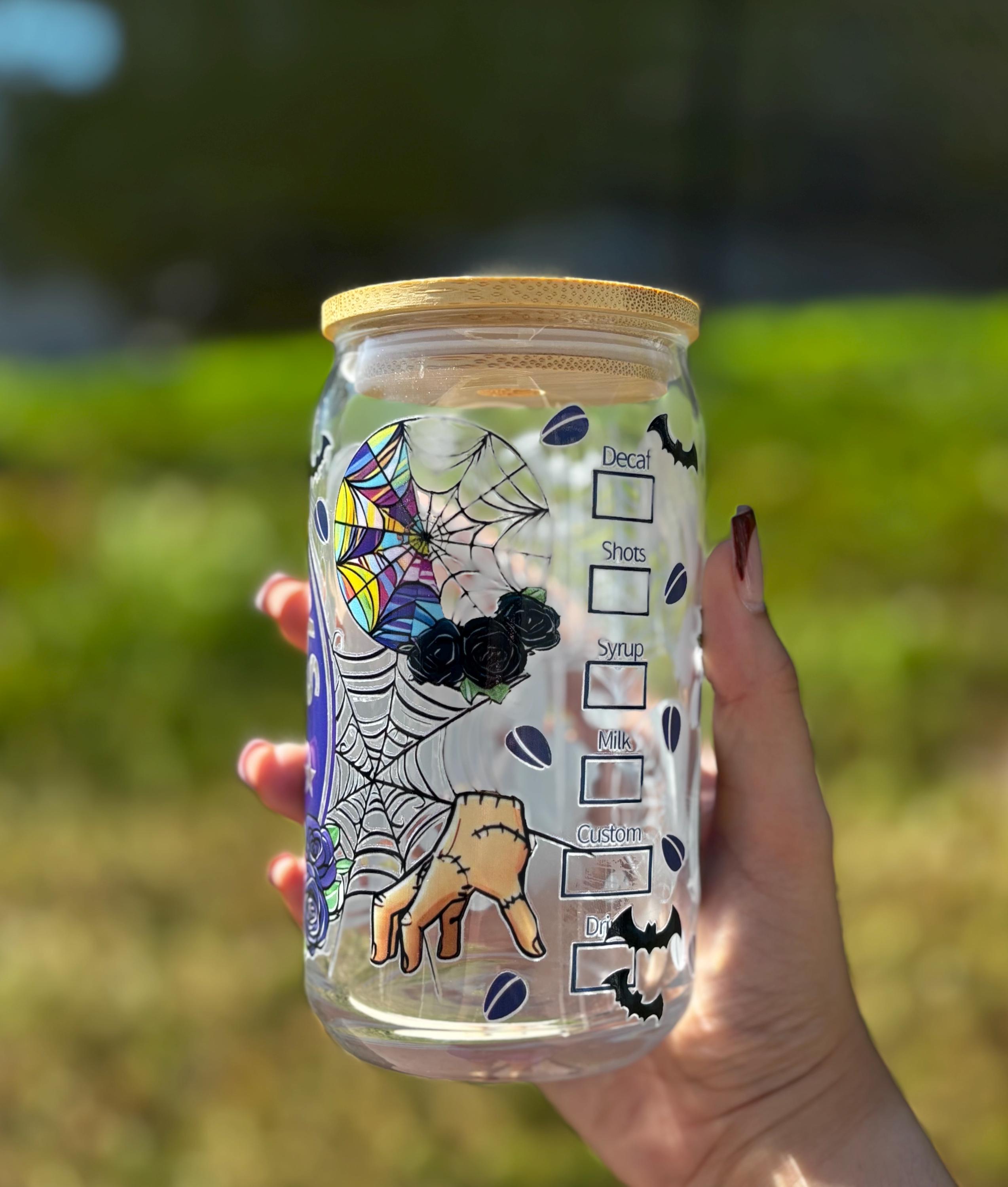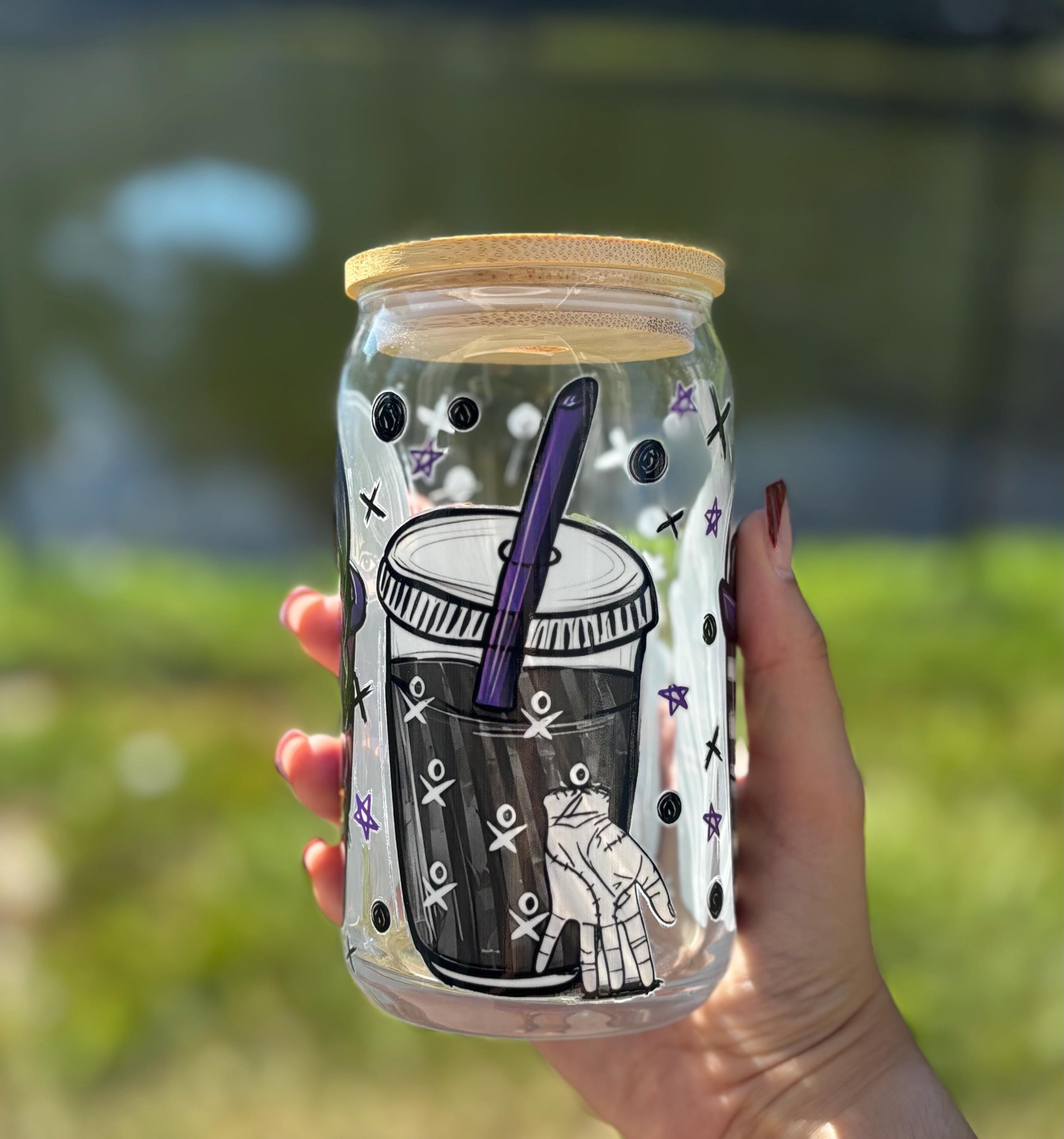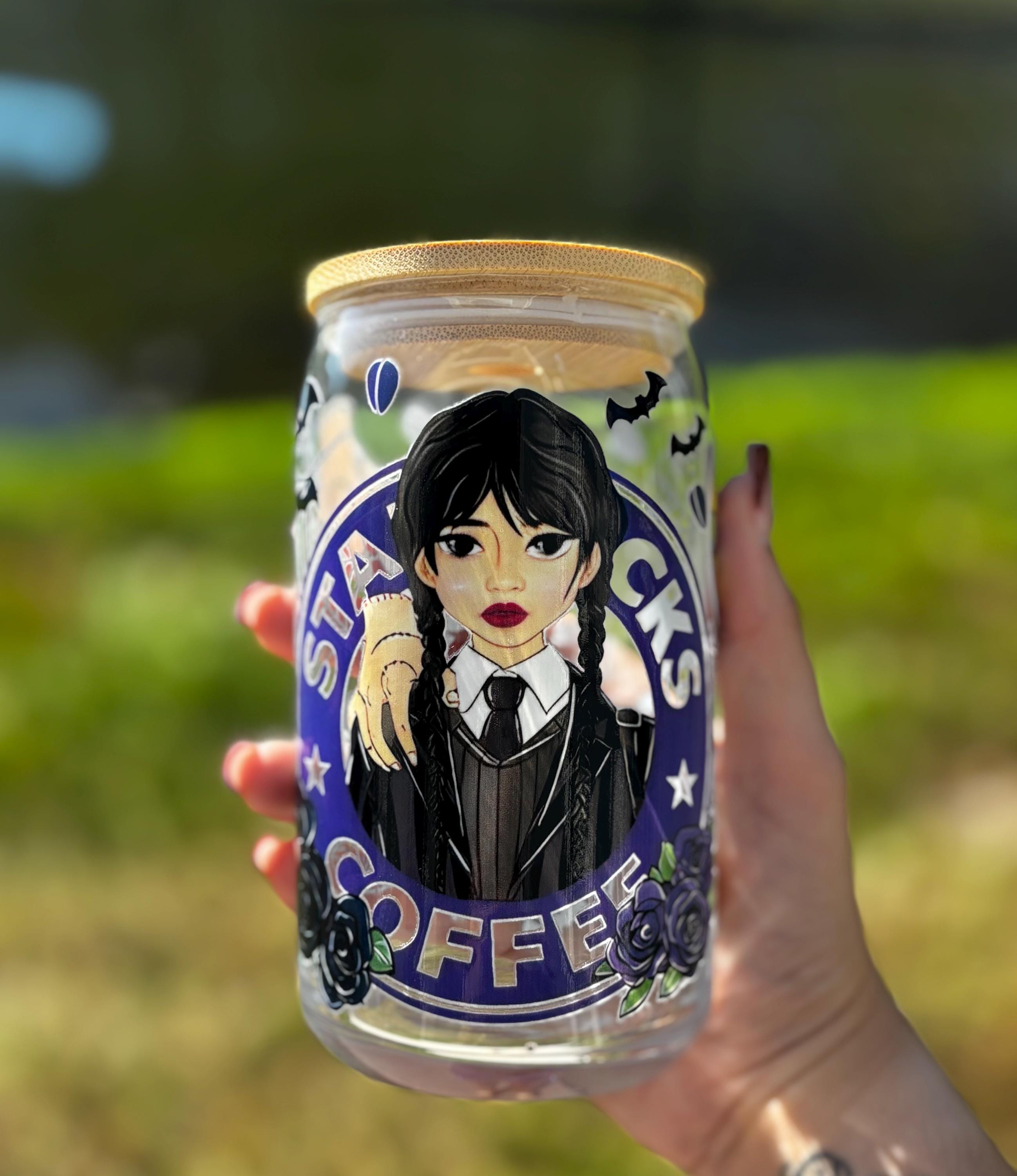 ✨ Details • Durable, reusable glass cup • Wednesday Addams Halloween design • Perfect for iced coffee, tea, or seasonal drinks • Fun gift for spooky season lovers